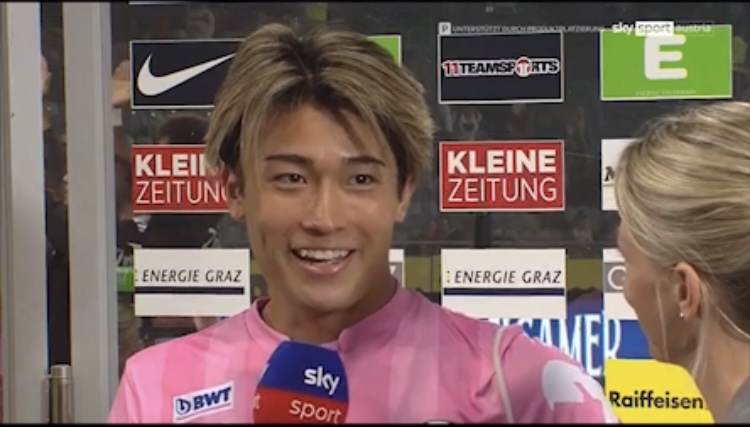 22-23シーズン アドミラルブンデスリーガ ラウンド5シュトュルム戦で先発出場し決勝ゴールを決める!チームも1-0で勝利し首位キープ!ヒーローインタビューを受ける。